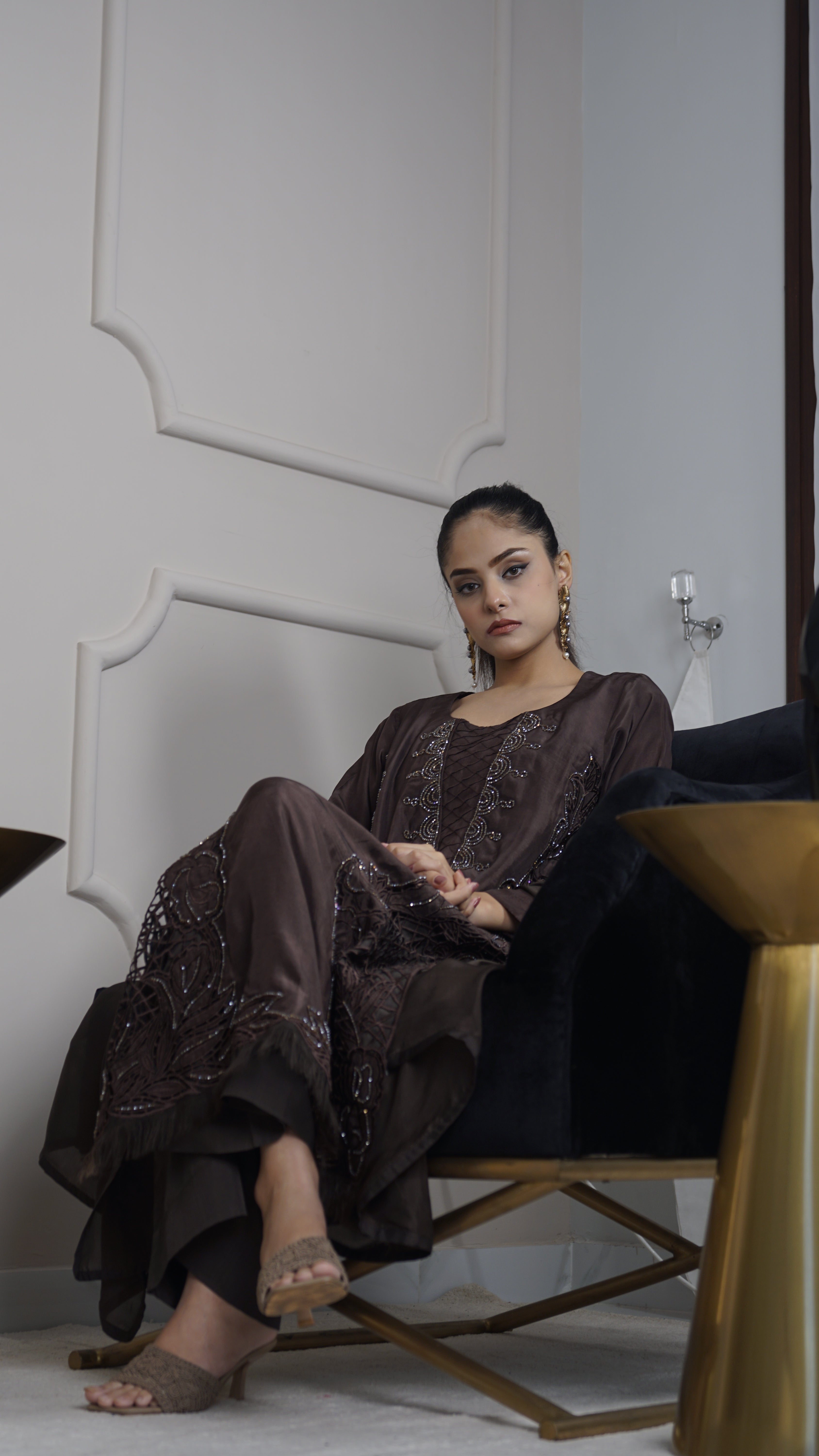 Chocolate brown silk elongated kameez with cutwork & crystals, paired with sleek silk culottes and a refined silk dupatta.